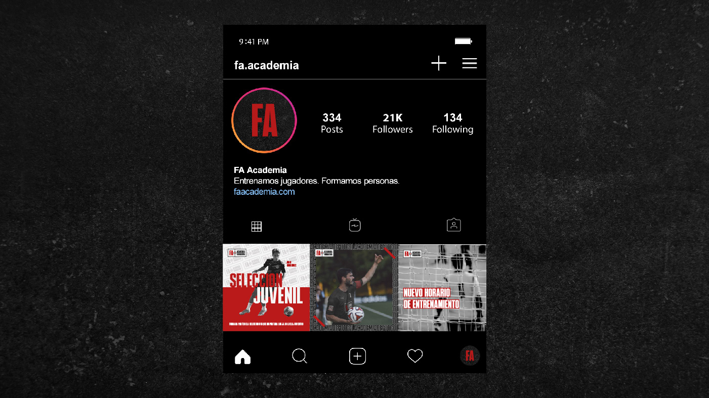 Creación de identidad de marca para academia de fútbol donde no solo se mejoran las habilidades deportivas. FA Academia también cuenta con profesionales de la nutrición, preparadores físicos, psicopedagogos y psicólogos. Para el equipo de FA no solo es importante el desarrollo deportivo del jugador sino en su formación como persona.